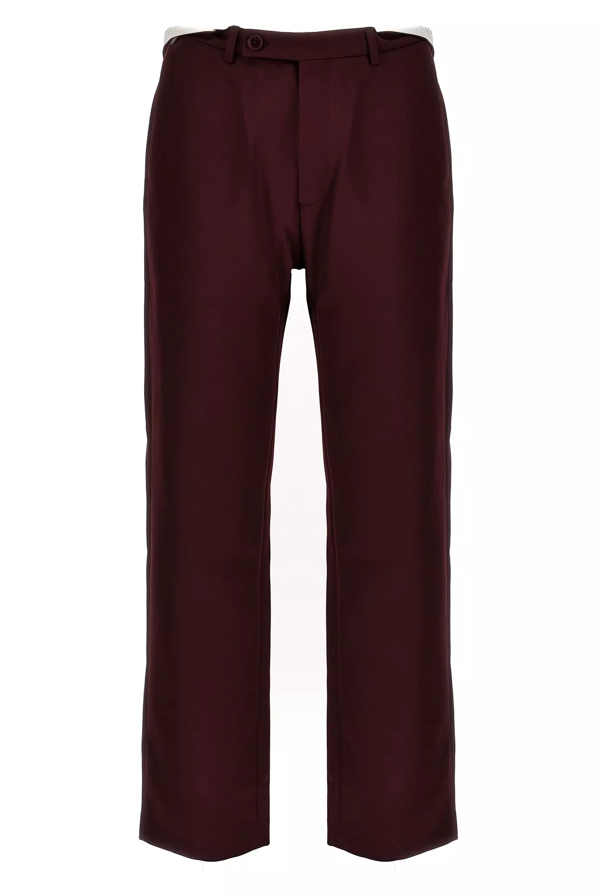 cod. MRAW23327BURG 'Rolled Waistband Tailored' trousers with turned-up waist detail and visible logo, zip, hook and button closure, pockets. Color: Bordeaux Size & Fit: true to size fit Composition: 100% polyester Made in: Mauritius