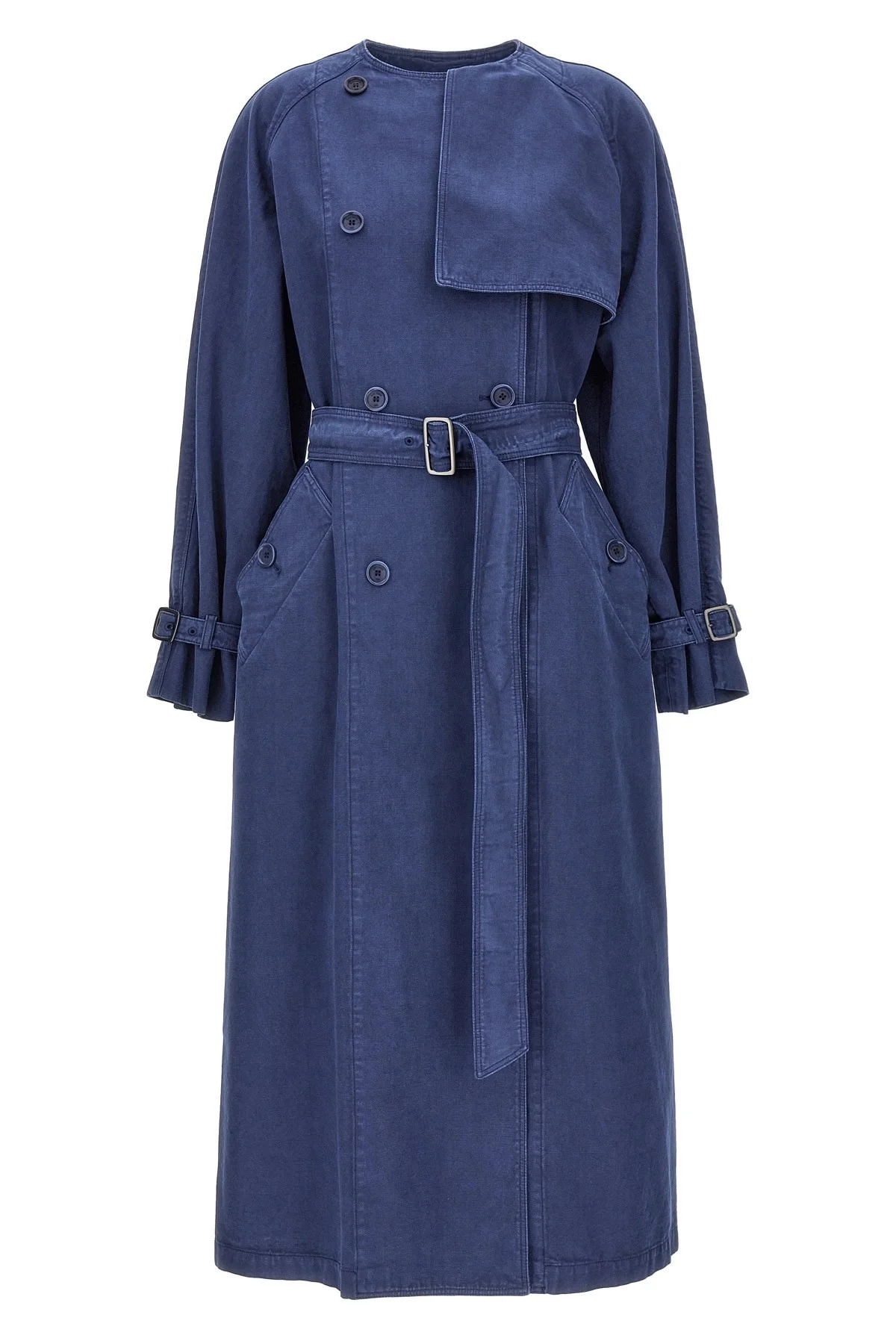cod. CALAO010 'Calao' double-breasted cotton trench coat with adjustable belt at the waist, long sleeves with adjustable straps, front pockets, back split. Color: Blue Size & Fit: True to size fit Composition: 100% cotton