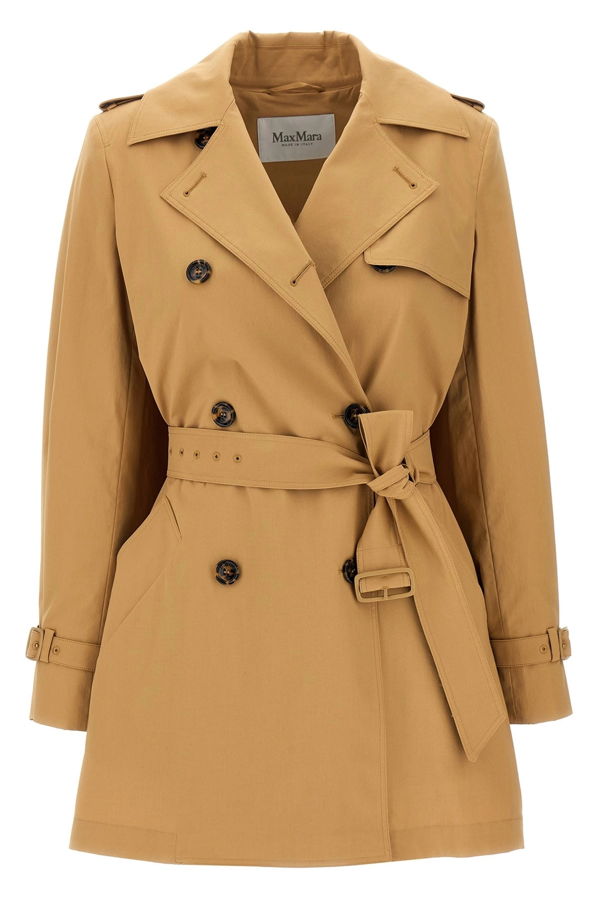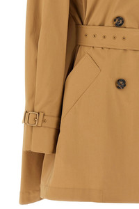 cod. 2511021012600010 'Landa' raincoat in heavy stretch cotton teardrop canvas, double-breasted model with front button closure, half lined, lapel collar, halberds, long sleeves, asymmetric panel on the back cape effect with belt inserted. Color: Brown Size & Fit: true to size fit Composition: 96% cotton, 4% elastane Made in: Italy