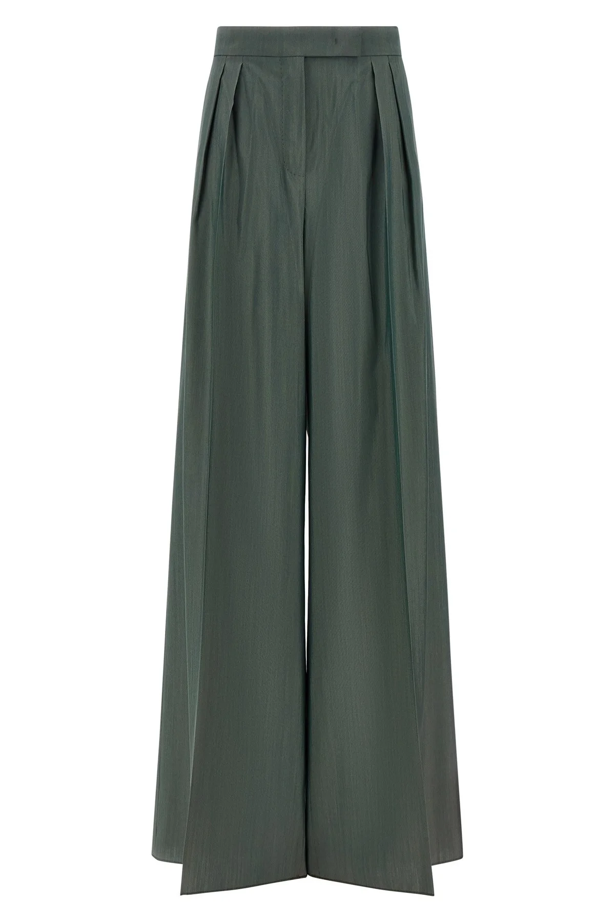 cod. 2611131042600003 'Mxgiallo' wool and silk trousers, tailored style, masculine cut with double front pleats, side hook and button closure and hidden zip, medium waist, straight leg with front stretched pleat, oblique side pockets. Color: Green Size & Fit: True to size fit Composition: 75% virgin wool 25% silk Made in: Italy