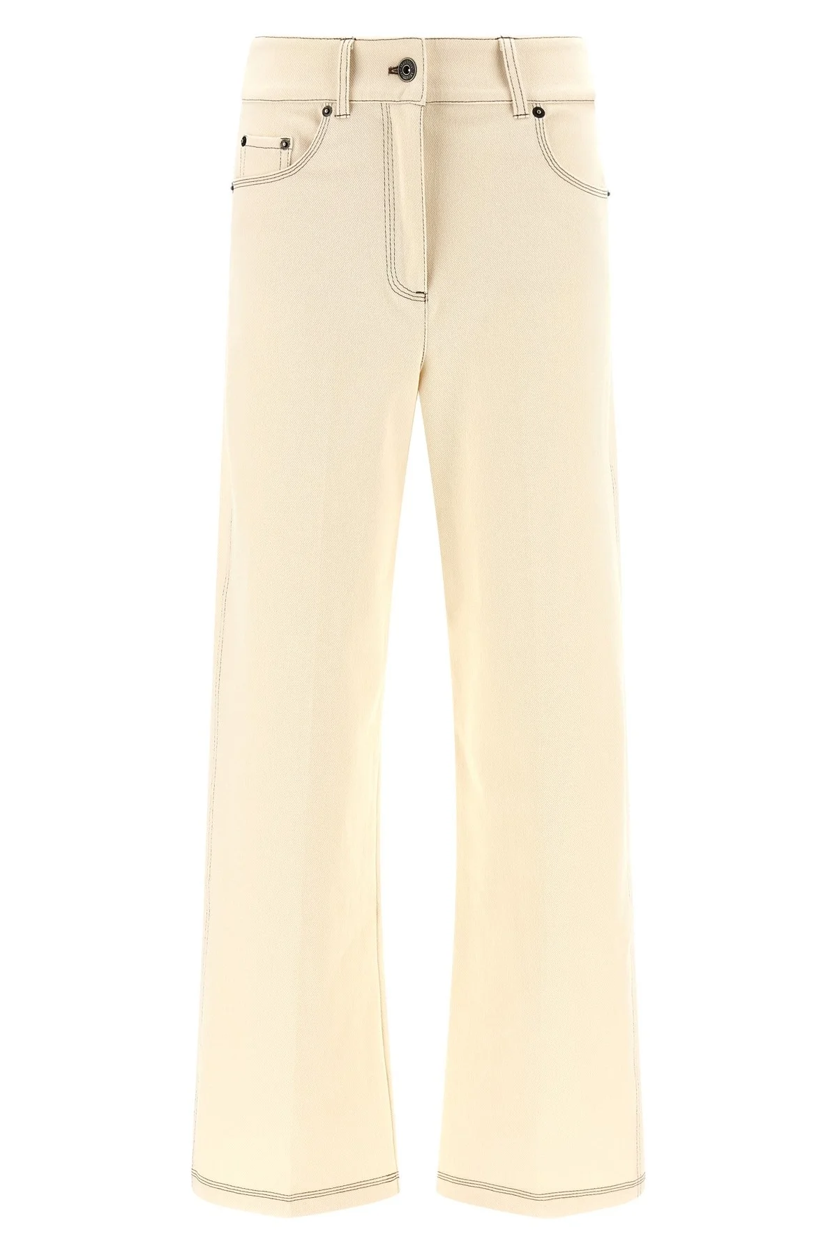 cod. 2611781088600001 Mxpribes' denim-effect jersey pants, 5-pocket style with denim-style details, contrast stitching and metal rivets, medium waist with straight leg and slightly cropped length, front button and zip closure, belt loops at the waist, leather back logo tag. Color: White Size & Fit: True to size fit Composition: 57% cotton 36% polyester 7% elastane Made in: China