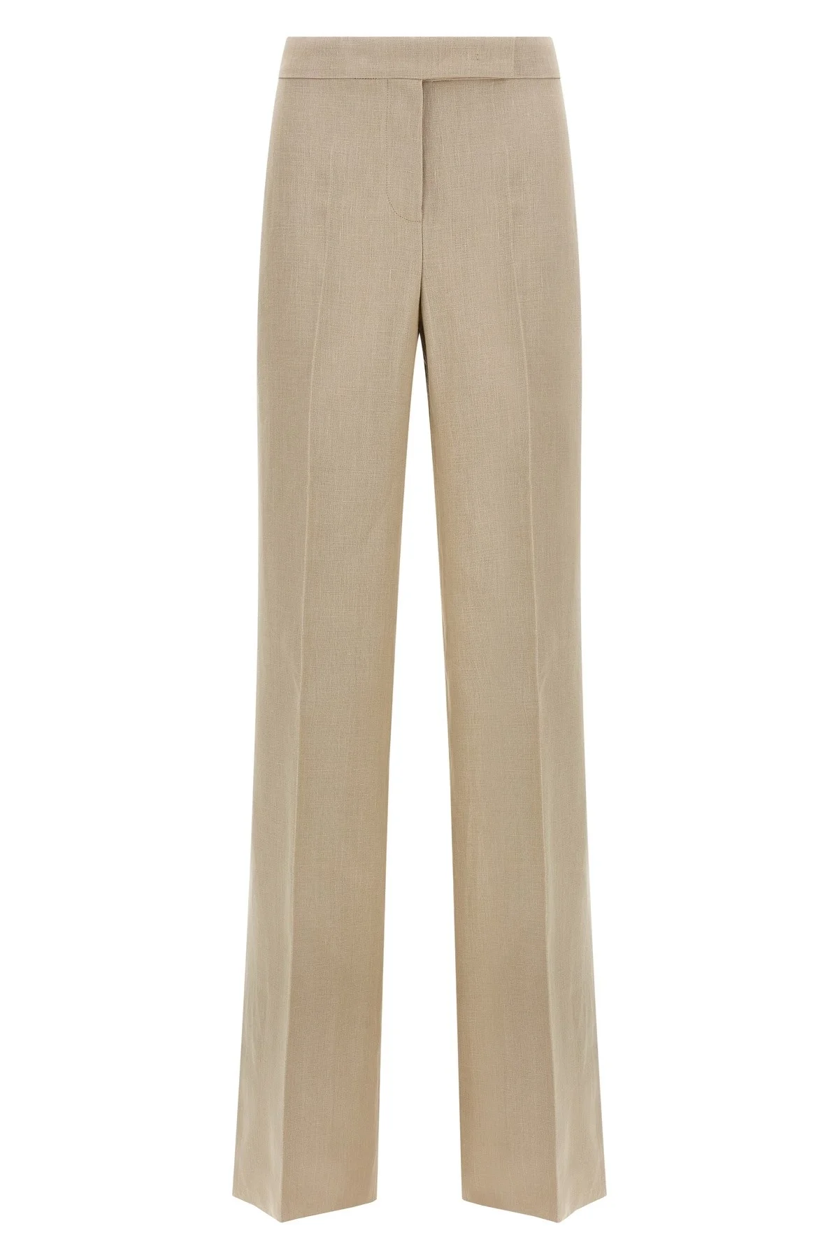 cod. 2611131283600001 'MxsAngus' heavy linen trousers, extra wide flared leg, stretched pleat, mid waist, zip hook and front button closure, front French pockets, back welt pockets, hem to be finished. Color: Beige Size & Fit: true to size fit Composition: 100% linen Made in: Italy