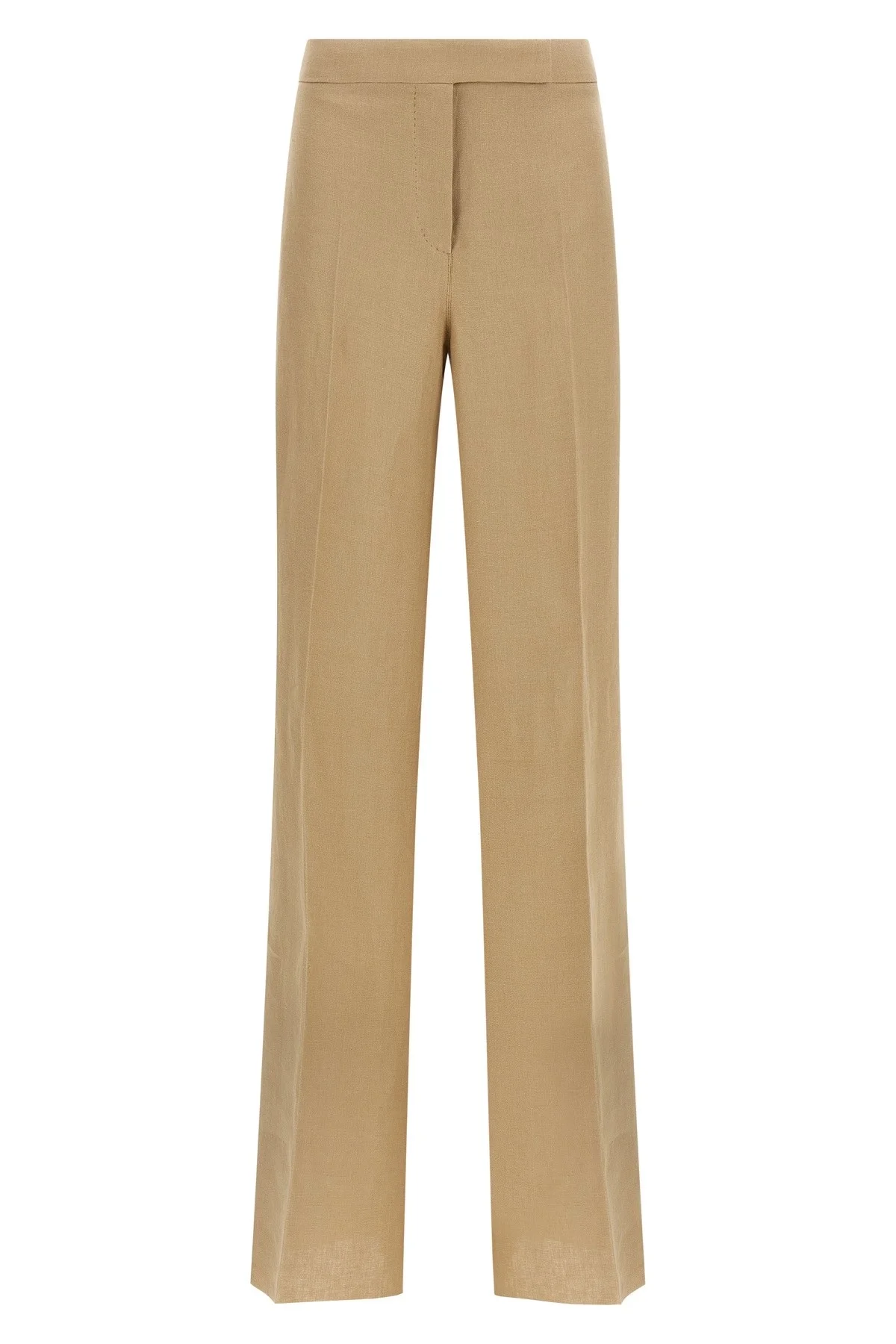 cod. 2611131243600003 'MxsBig' pure linen natte trousers, flared wide leg, stretched pleat, back pincer, high waist, front zip hook and button closure, front American pockets, back welt pockets. Color: Beige Size & Fit: true to size fit Composition: 100% linen Made in: Italy
