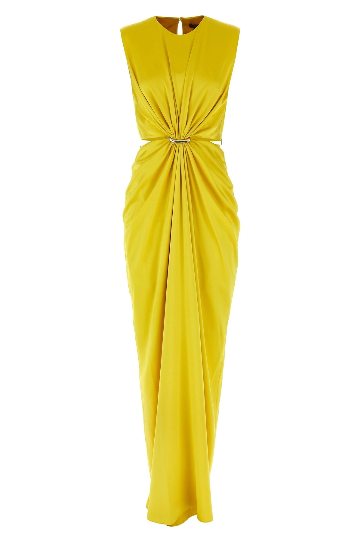 cod. 2511221024600010 Panaro' sleeveless dress in silk satin with hourglass style, front draping with metal detail, cut-out on the sides, back zip and hook closure. Color: Yellow Size & Fit: True to size fit Composition: 100% silk Made in: Italy