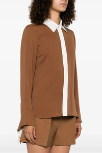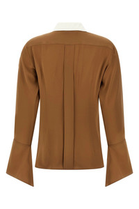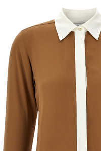cod. 2511111021600003 'Pio' heavy silk charmeuse shirt with contrast color block details, button closure, long sleeves with ruffled cuffs, rounded side slits on the hem. Color: Brown Size & Fit: true to size fit Composition: 100% silk Made in: Portugal