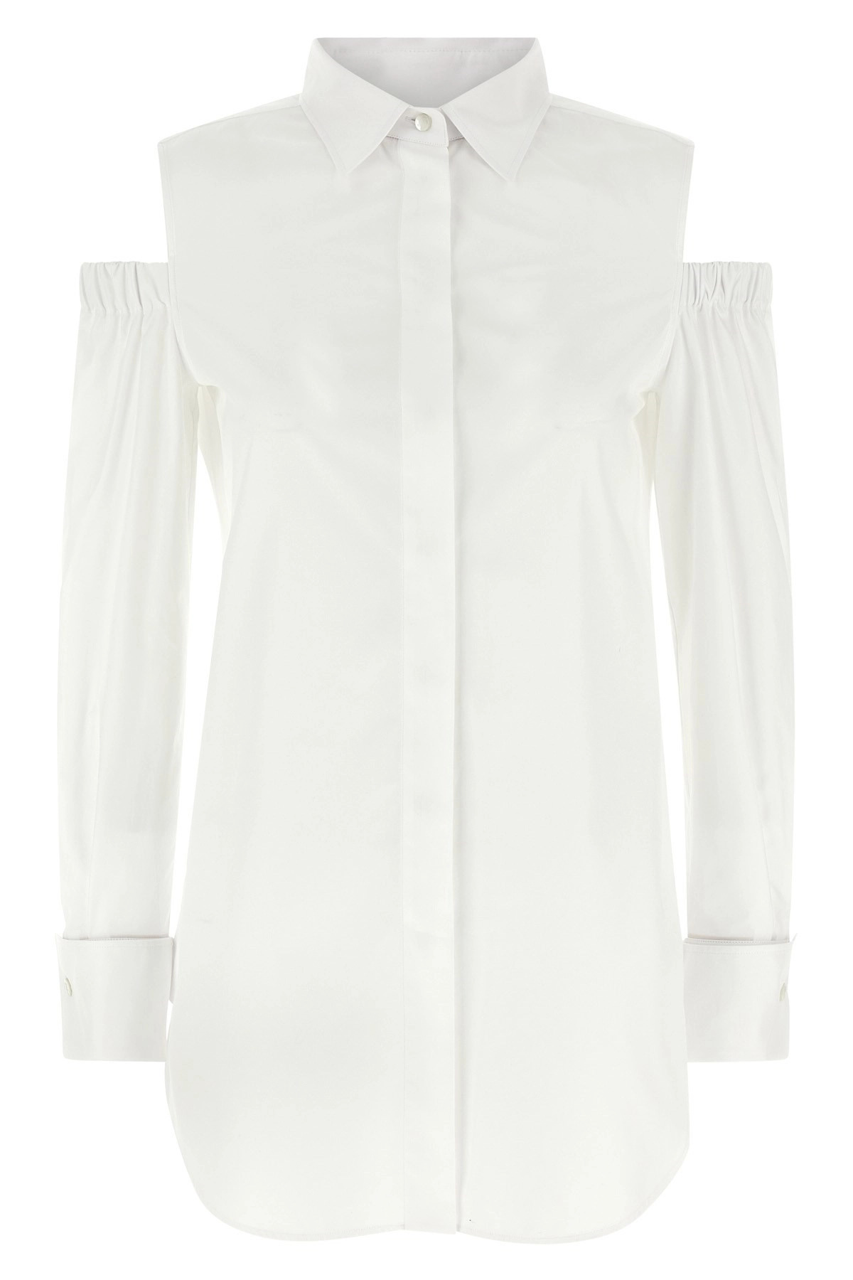 cod. 2511191032600001 'Ragni' stretch cotton poplin shirt, long male model with a straight line, long sleeves with elastic cut-out detail curled on the shoulder, high cuffs with twin button, asymmetric hem, side slits, button closure. Color: White Size & Fit: true to size fit Composition: 100% cotton Made in: Italy
