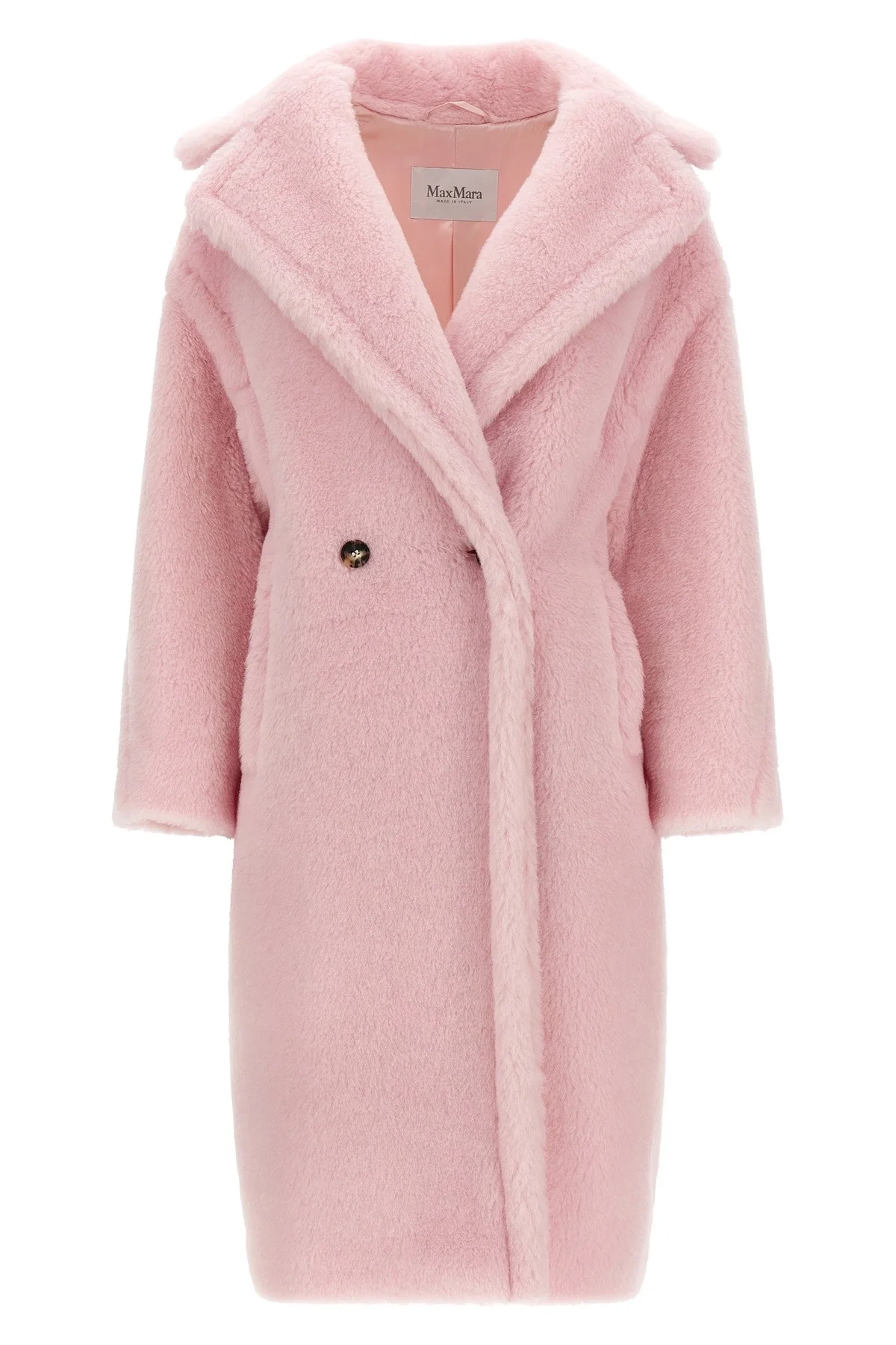 cod. 2611011011600030 Tedgirl - Teddy Bear Icon' double-breasted coat in alpaca and wool on silk base with front horn button closure, lapel collar, pockets, long sleeves with dropped shoulders, and M monogram jacquard viscose lining. Color: Pink Size & Fit: oversized fit Composition: 62% wp, 26% wv, 12% se Made in: Italy PROMO CODE NOT APPLICABLE