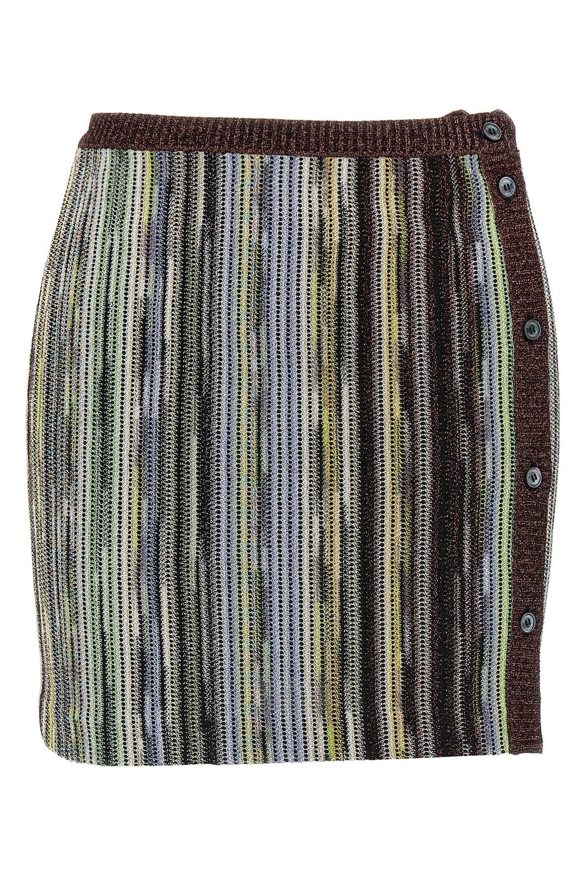 cod. DS25SH0IBR002HSM9KS Mini skirt in viscose blend with lame filaments worked with 'Caperdoni' weave, elastic waistband, front button closure, lining. Color: Multicolor Size & Fit: true to size fit Composition: 83% viscose, 17% metal Made in: Italy