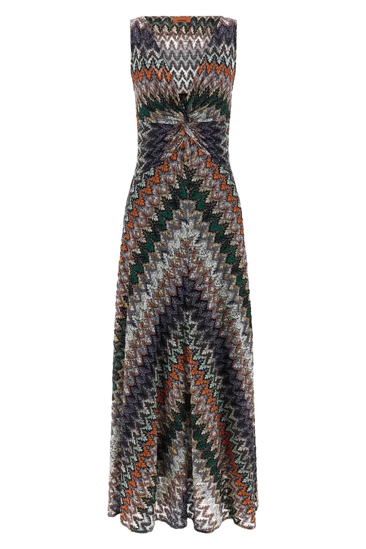 cod. DS26SG1SBR014ZS72OW Long viscose lame dress with zigzag lace raschel pattern, V-neck with front knot detail, sleeveless, hourglass silhouette with flared skirt, removable petticoat with thin straps. Color: Multicolor Size & Fit: true to size fit Composition: 52% vi 39% co 9% me Made in: Italy