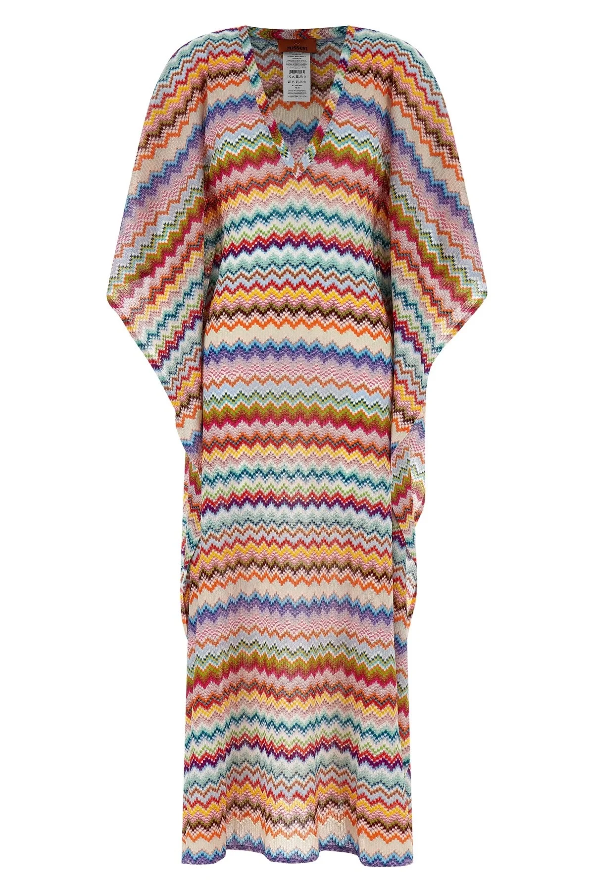 cod. MC23SQ05BR014FSM9WV Long semi-transparent knit dress with zigzag pattern, V-neck kaftan style with wide bat sleeves. Color: Multicolor Size & Fit: True to size fit Composition: 83% viscose, 17% metal Made in: Italy