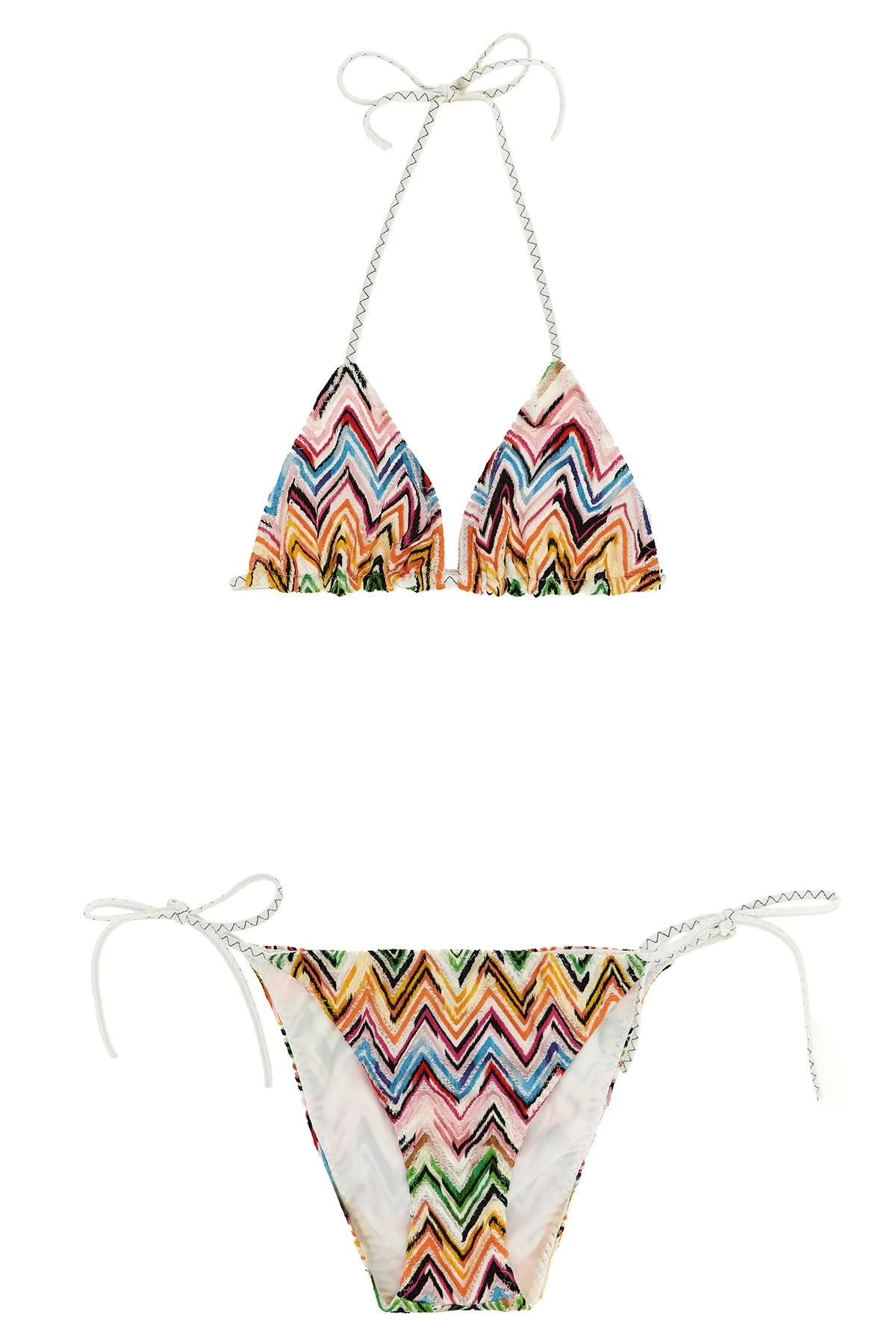 cod. MC22SP00BJ00QLSM9Z9 Stretch viscose bikini with zigzag pattern with lace inserts, triangle top with laces, briefs with medium coverage and lacing on the sides. Color: Multicolor Size & Fit: true to size fit Composition: 75% viscose 15% polyamide 10% elastane Made in: Italy