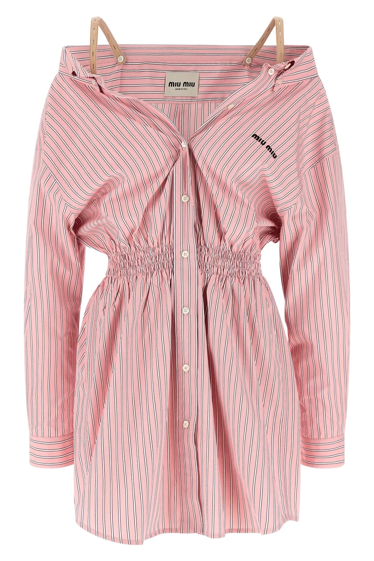 cod. MF6125SOOO180UF0028 Striped cotton poplin mini dress, off-the-shoulder shirt style, adjustable and removable braces, logo embroidery and front button closure, smock stitching at the waist, long sleeves with cuffs. Color: Pink Size & Fit: true to size fit Composition: 100% cotton Made in: Italy PROMO CODE NOT APPLICABLE