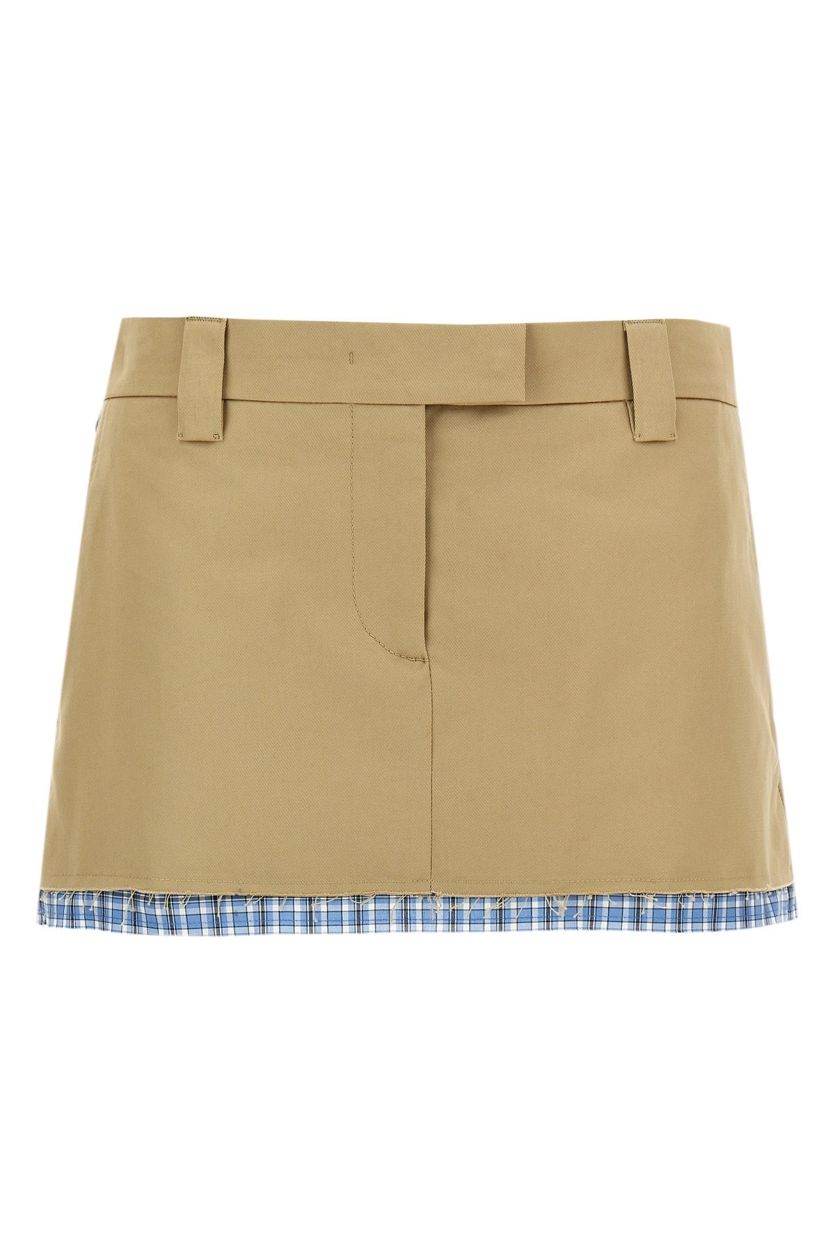 cod. MG2383SOOO1UPXF0065 Cotton mini skirt with contrasting layered detail on the hem, back logo patch, hook and button zip closure, pockets. Color: Beige Size & Fit: true to size fit Composition: 100% cotton Made in: Italy