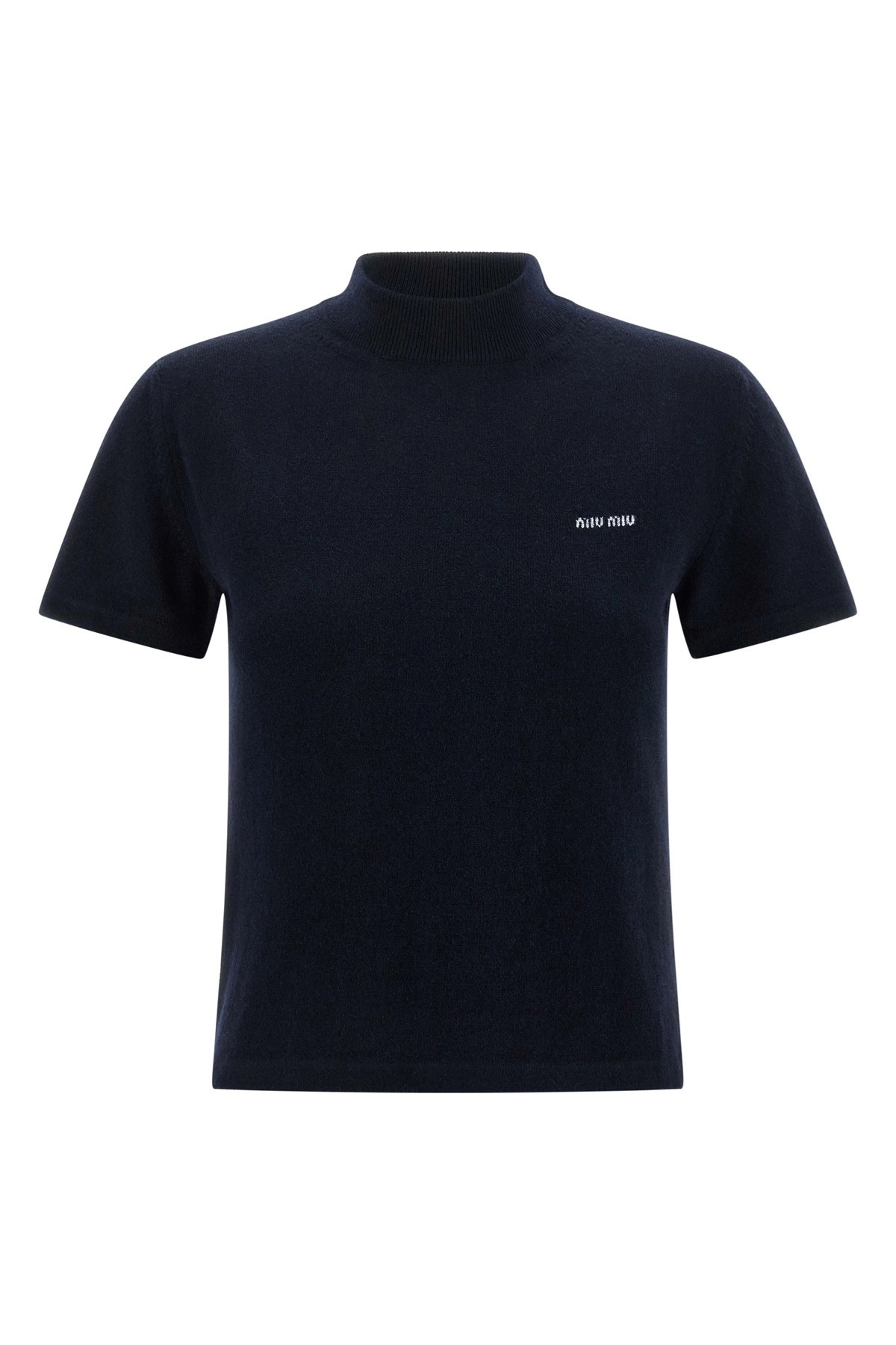 cod. MMR451SOOO18A9F0008 Cashmere sweater with front logo intarsia, high neck and short sleeves. Color: Blue Size & Fit: true to size fit Composition: 100% cashmere Made in: Italy PROMO CODE NOT APPLICABLE