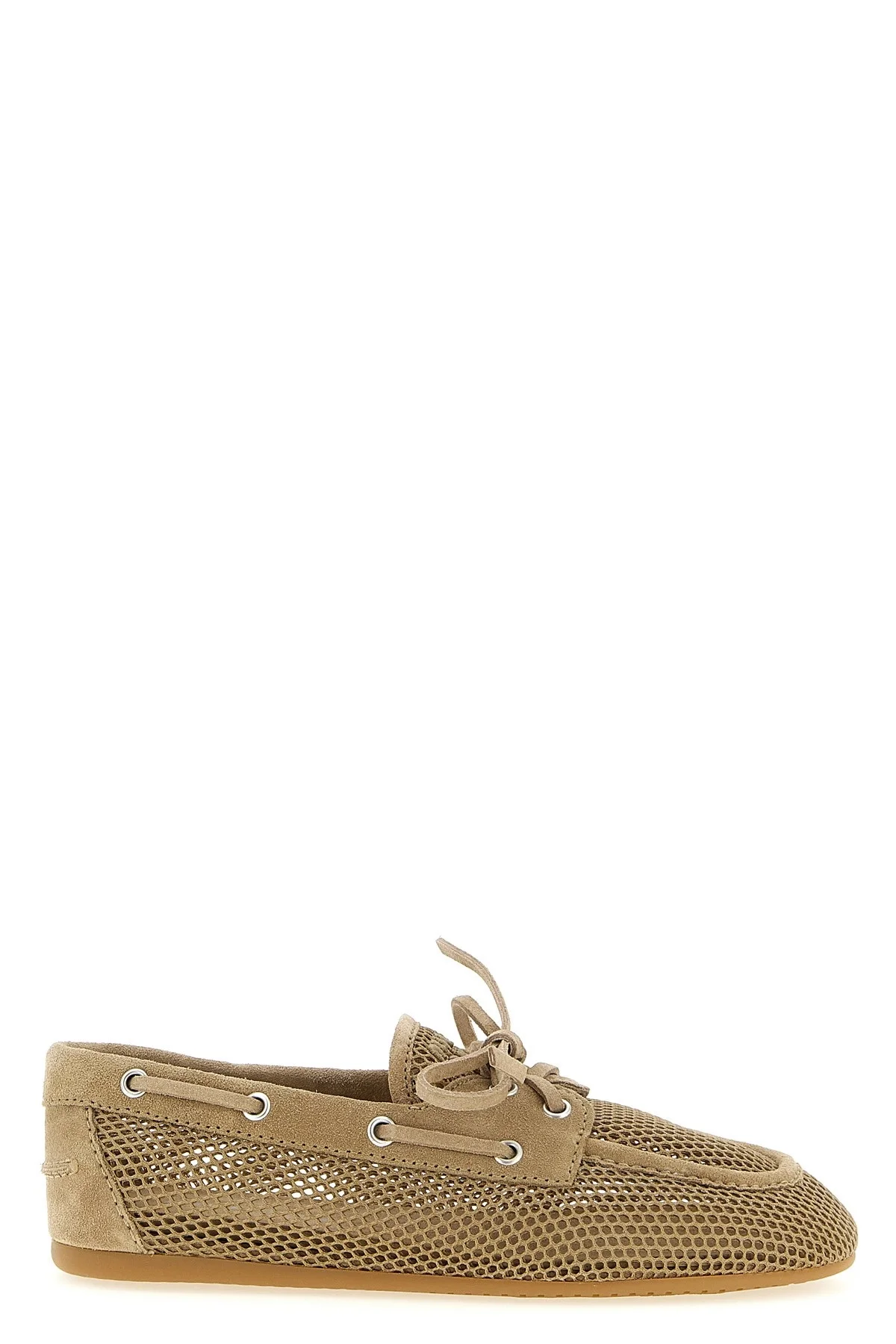 cod. 5D585EF0053KU1F0F24 Mesh and suede boat shoe with tone-on-tone logo embroidery on the front, almond toe, lace-up closure, rubber sole. Color: Beige Size & Fit: EU WOMEN Composition: 100% recycled polyester Made in: Italy PROMO CODE NOT APPLICABLE
