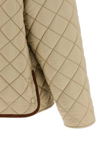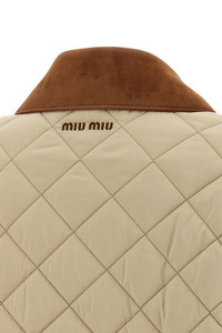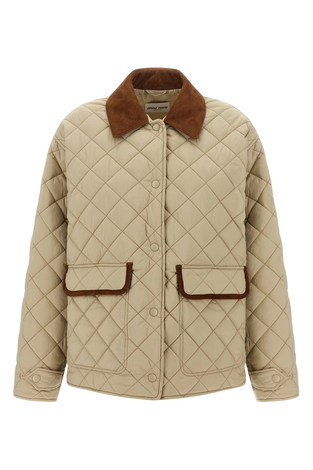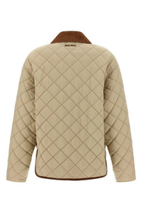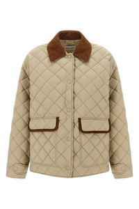cod. ML1311SOOO17OOF0036 Lightly padded quilted synthetic fabric blouson with suede details, shirt collar, front button closure, pockets, back logo embroidery, long sleeves, side slits with snap buttons. SUSTAINABLE: Product made from recycled polyester. Color: Beige Size & Fit: true to size fit Composition: 100% recycled polyester Made in: Italy