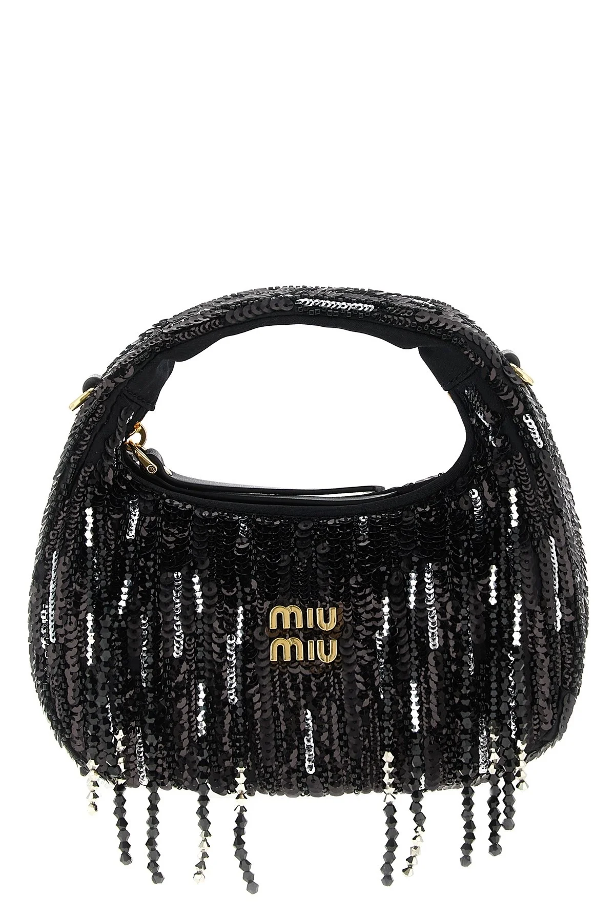 cod. 5BP078VWON2IGMF0002 Mini 'Wander' satin handbag with all-over sequin applique and crystal fringes, front metal lettering logo, top zip closure, fixed handle, removable chain shoulder strap. Color: Black Size & Fit: W 17.5 x H 14 x D 5.5 cm Composition: 100% polyester Made in: Italy PROMO CODE NOT APPLICABLE