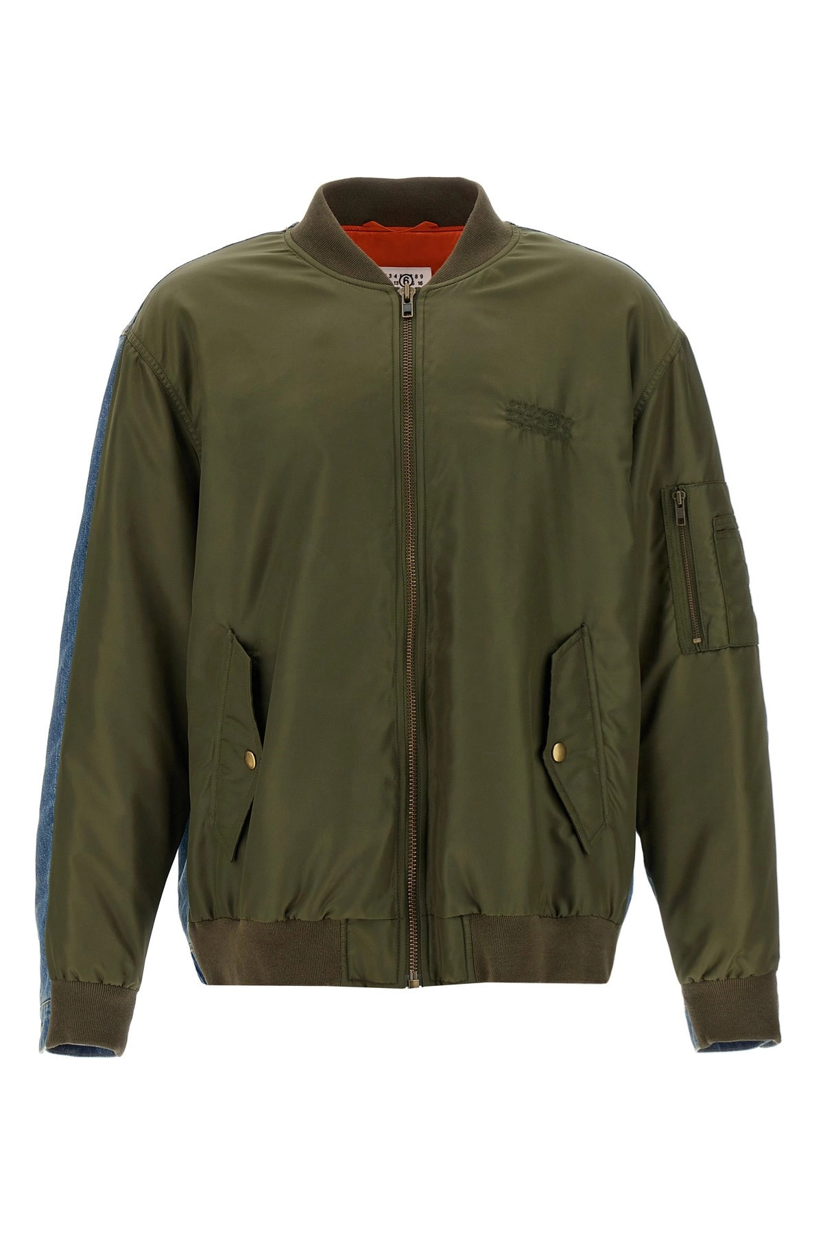 cod. SH0AM0044MTN038961 Two-material bomber jacket in nylon and used-effect cotton denim with lining, front 'Numeric signature MM6' embroidery, zip closure, pockets, back 'White stitch line', long sleeves with cuffs. Color: Multicolor Size & Fit: Comfort fit Composition: 100% polyamide Made in: Italy