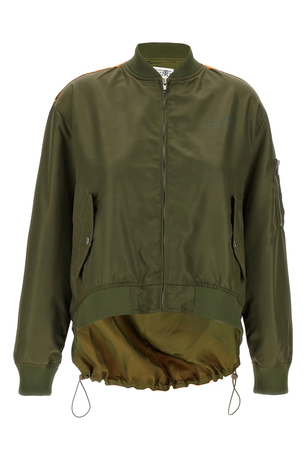 cod. S52AM0315M35257728 Nylon jacket with contrast inserts, asymmetric hem, 'Numeric signature MM6' logo print on the front, 'White stitch line' on the back, zip closure, pockets, long sleeves with elastic cuffs, back drawstring on the hem. Color: Green Size & Fit: Comfort fit Composition: 100% polyamide Made in: Italy