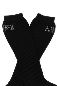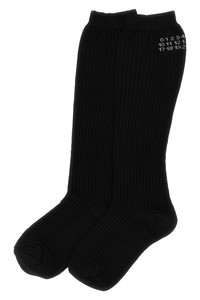 cod. S62TL0045M13204900 'Bootleg' ribbed viscose blend socks with inlaid 'Numeric signature MM6' logo. This model is made with a material obtained through a particular artisan production process that makes it a unique piece. They are absolutely normal differences in appearance between one garment and another. Color: Black Size & Fit: true to size fit Composition: 80% viscose 15% polyester 5% el Made in: Italy PROMO CODE NOT APPLICABLE