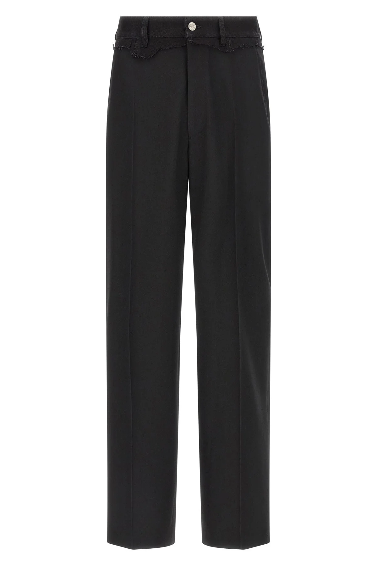 cod. SH0KA0062MTN133961 Wool trousers with tone-on-tone cotton denim insert with raw hem at the waist, tailored design, hybrid cut-and-paste construction, wide leg, stretched pleat, front zip and button closure, pockets, logo tag and 'White Stitch Line' at the back. Color: Black Size & Fit: true to size fit Composition: 55% polyester, 45% virgin wool Made in: Italy
