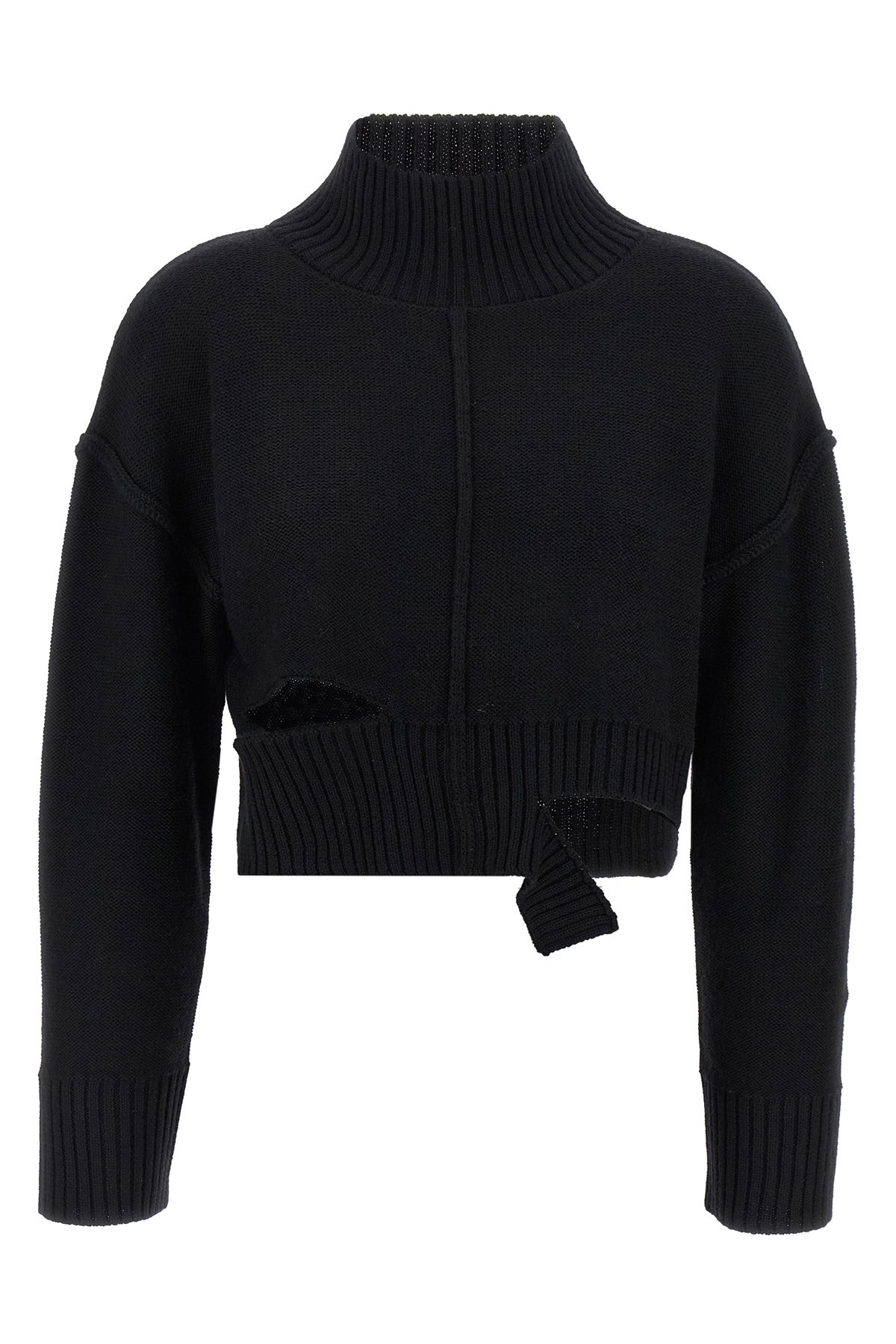 cod. S52HA0285M13044900 Sweater in wool blend fineness 5 distressed effect with torn details, crop model, high neck, long sleeves with cuffs and dropped shoulder, 'White stitch line' back. Color: Black Size & Fit: Comfort fit Composition: 50% virgin wool 50% acrylic Made in: Italy