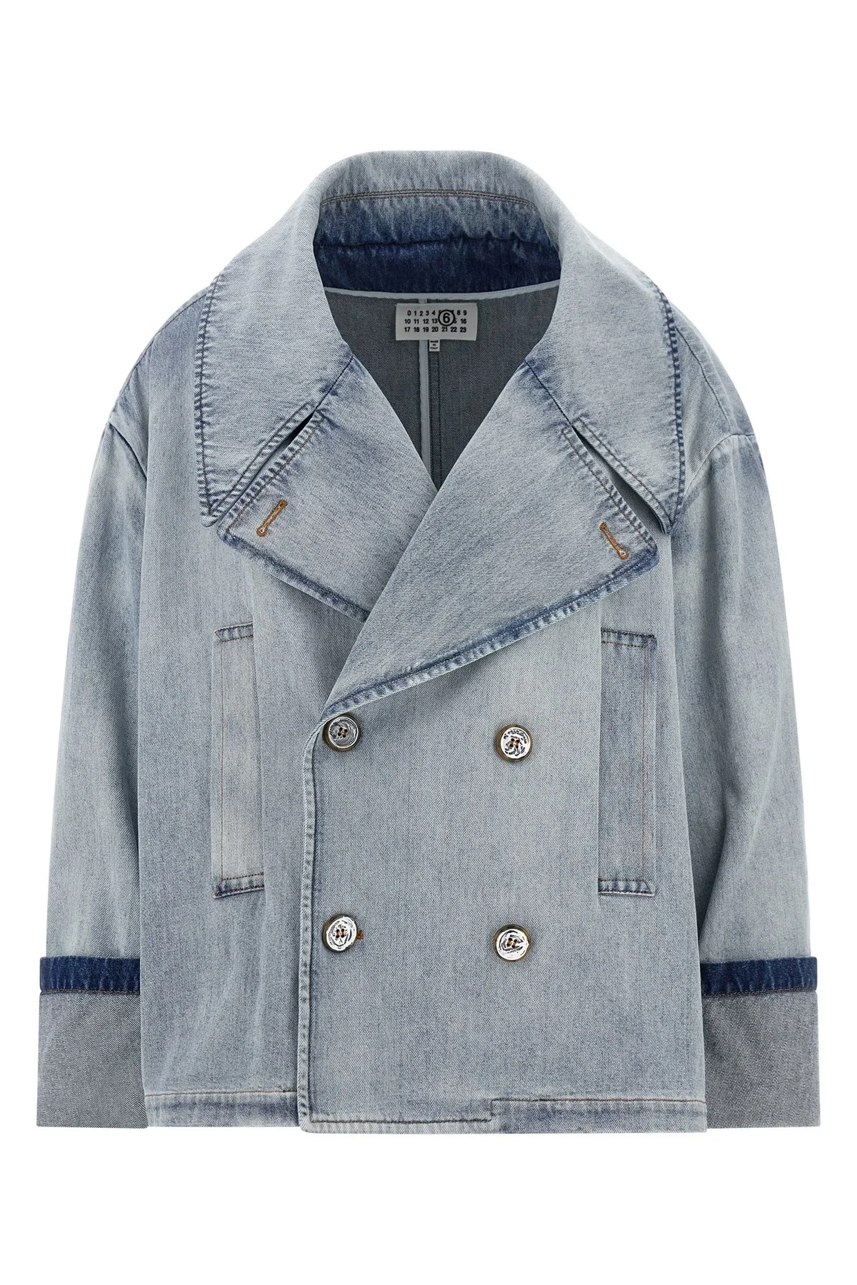 cod. S52AM0357M30055962 Cotton denim jacket with contrast stitching, panel construction, double-breasted style with front button closure, lapel collar, pockets, long wide sleeves with turn-up on the cuffs and dropped shoulders, back 'White Stitch Line', unlined, asymmetric hem. Color: Light Blue Size & Fit: oversized fit Composition: 100% cotton Made in: Italy