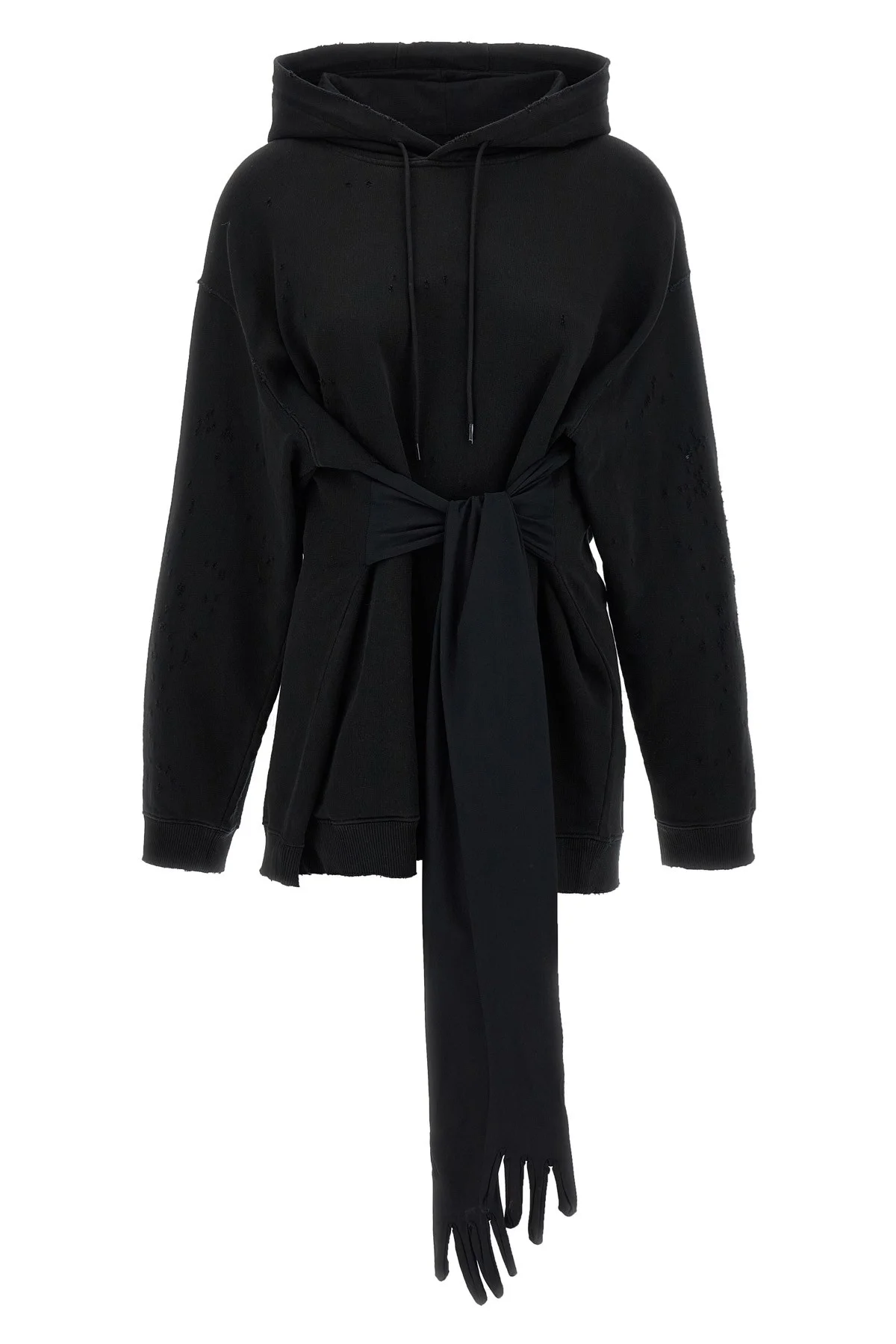 cod. S52DA0083M25025900 Cotton jersey hoodie mini dress with used effect style, raw cut hem, kangaroo pocket with logo patch, 'White Stitch Line' at the back, long sleeves with dropped shoulders, tonal Lycra cuffs and gloves stitched at the waist. The garment can be worn as a classic sweatshirt using gloves as a belt at the waist or by letting the long sleeves fall along the body and using gloves as sleeves. Color: Black Size & Fit: oversized fit Composition: 100% cotton Made in: Italy