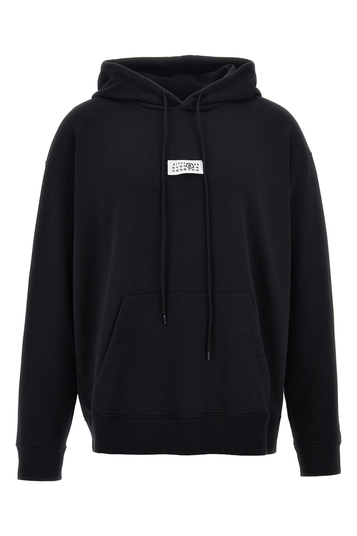 cod. SH0GU0033M25025900 Brushed cotton hoodie with front 'Numeric signature MM6' patch, kangaroo pocket, long cuffed sleeves and dropped shoulders, and 'White stitch line' at the back. Color: Black Size & Fit: Comfort fit Composition: 100% cotton Made in: Portugal