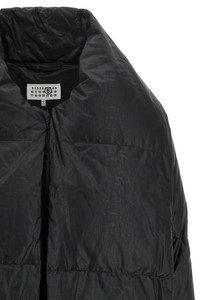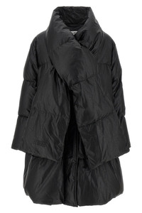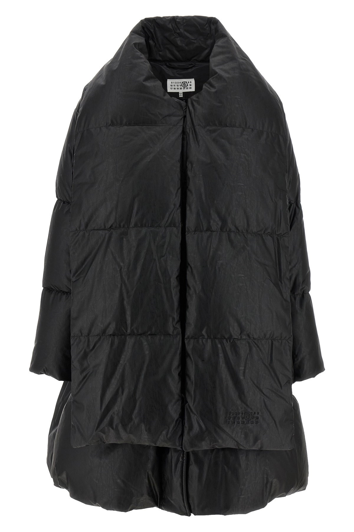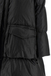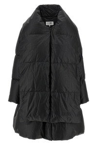 cod. S52AA0193S53057900 Long down jacket in quilted leather-effect coated viscose with goose down padding, collar with scarf insert to tie or leave along the waist, zip and snap button closure on the front, pockets, long sleeves with knitted cuffs. Color: Black Size & Fit: Comfort fit Composition: 100% viscose Made in: Italy