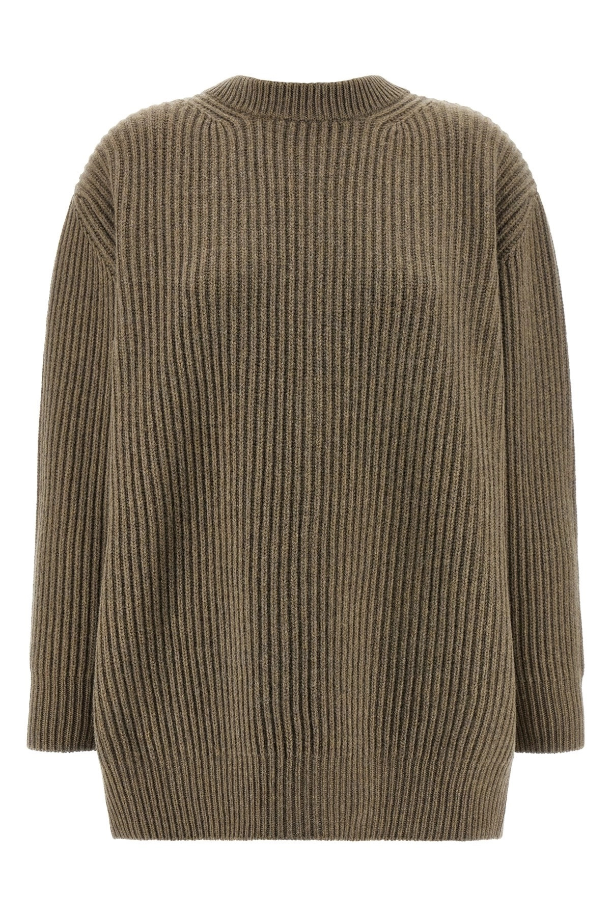 cod. S62HL0042M13193114 Ribbed wool knit mini dress, sweater, crew neck, long sleeves with dropped shoulder, tone-on-tone stretch knit back panel to adjust the width, 'White stitch line' at the back. Color: Beige Size & Fit: oversized fit Composition: 80% virgin wool 20% polyester Made in: Italy