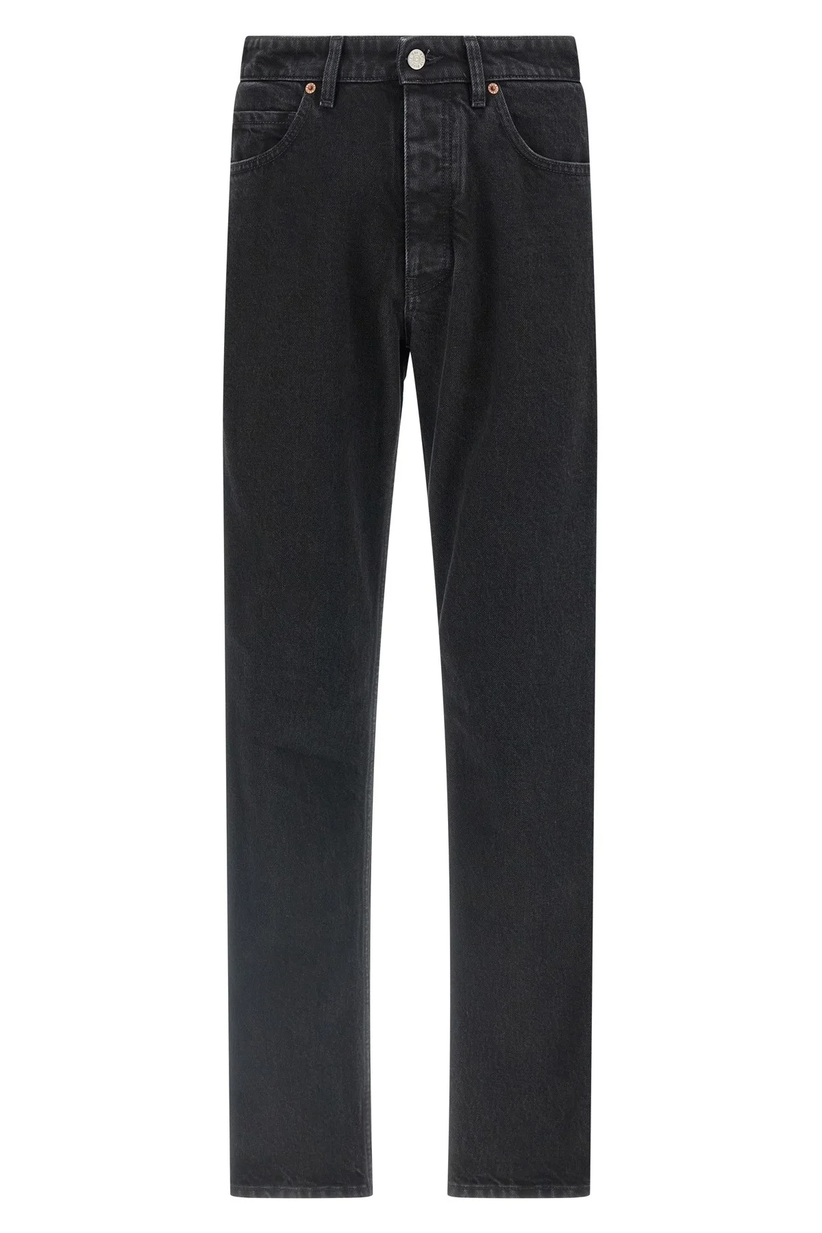 cod. SH2LA0035S30743972 Garment-dyed cotton denim jeans with tone-on-tone side taped bands, straight leg, front button closure, five pockets, 'White stitch line' and tone-on-tone 'Numeric signature MM6' patch on the back. Color: Black Size & Fit: true to size fit Composition: 100% cotton Made in: Italy