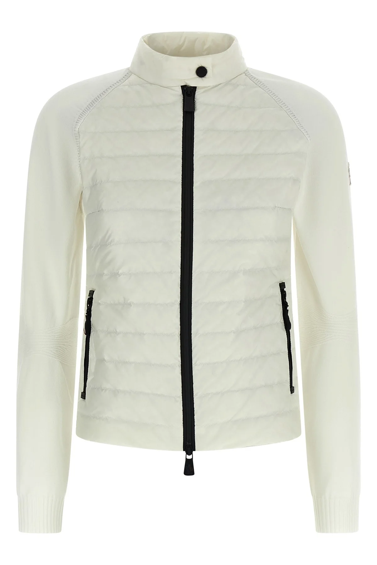 cod. L10989B00001M1183034 Stretch viscose blend crepe cardigan with shaved knit and linz stitch 15 fineness, quilted and goose feather padded saison front part, standing collar with snap button, front zip closure, pockets, long raglan sleeves with cuffs. Color: White Size & Fit: true to size fit Composition: 100% polyamide Made in: Moldova PROMO CODE NOT APPLICABLE