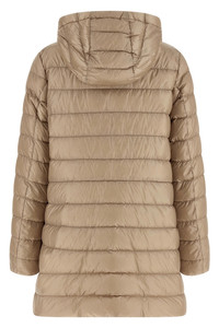 cod. L10931A00029597YG212 'Jasmin' water-repellent longue saison quilted down jacket with goose down padding, adjustable hood, high neck, front zip closure, tapered waist with drawstring, pockets, long sleeves with elastic cuffs and felt logo patch applique. Color: Beige Size & Fit: Slim fit Composition: 100% polyamide Made in: Moldova