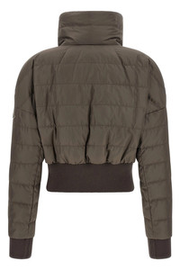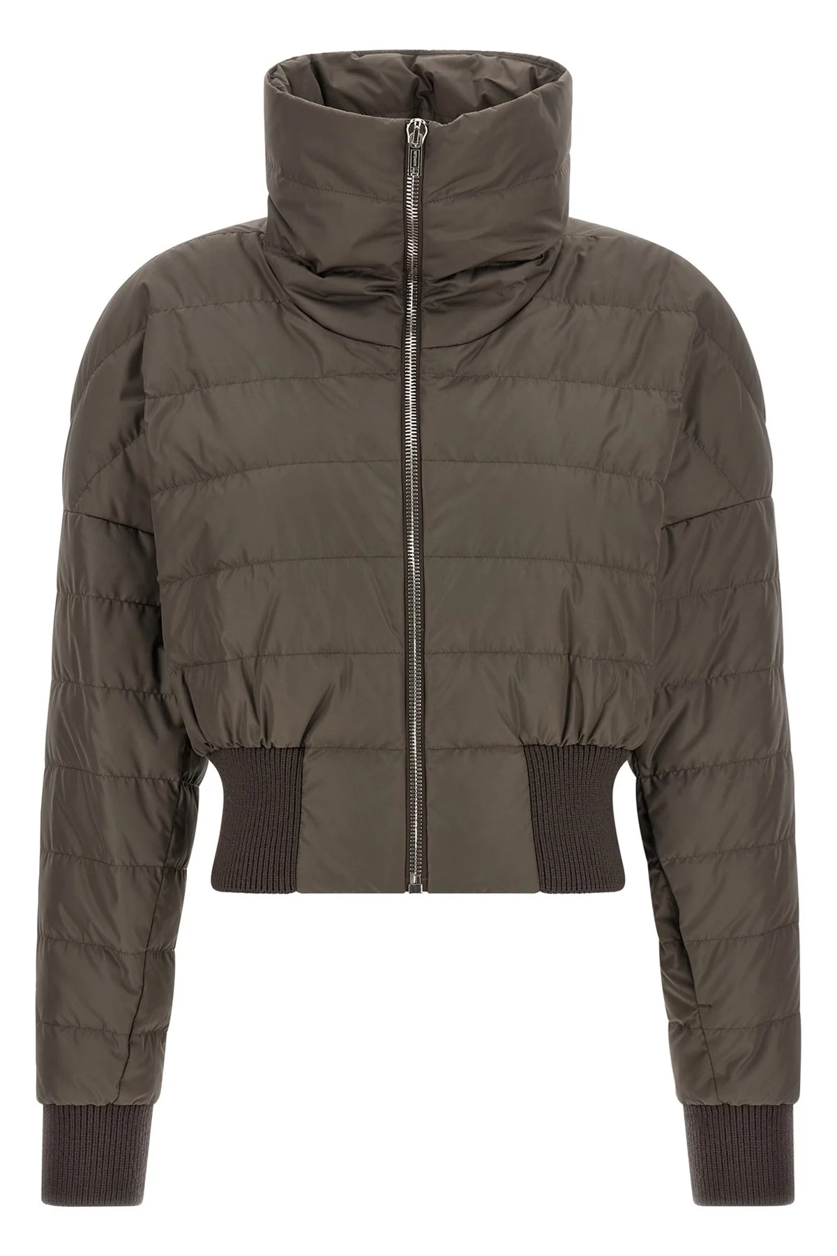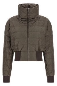 cod. MU01F1A05M8115828 Moncler + Rick Owens 'Cropped' down jacket in quilted saison longue with goose down padding, tone-on-tone ribbed stretch knit details, crop style, crater neck, front zip closure, long cuffed sleeves, dropped shoulders and logo patch applique, and headband.eadband. Color: Gray Size & Fit: true to size fit Composition: 100% polyester Made in: Romania PROMO CODE NOT APPLICABLE