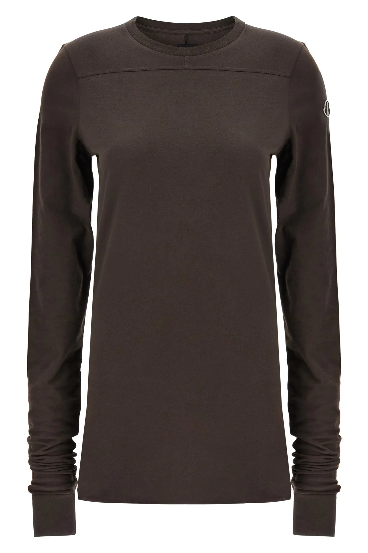 cod. MU01F8D0189AHD256 Moncler + Rick Owens T-shir Girder t in stretch cotton jersey, crewneck, long cuffed sleeves, logo patch, and raw cut hem.cut hem. Color: Brown Size & Fit: Comfort fit Composition: 100% cotton Made in: Turkey PROMO CODE NOT APPLICABLE