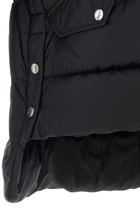 cod. K24031A00009M6526999 Moncler x Edward Enninful 'Blas' quilted nylon jacket with goose down padding, flared silhouette, high neck, front zip closure, pockets, long sleeves with elastic cuffs and tone-on-tone logo patch applique, side slits with snap buttons, drawstring on asymmetrical hem. Removable inner backpack braces to carry the garment without using your hands. Color: Black Size & Fit: Comfort fit Composition: 100% polyamide Made in: Romania PROMO CODE NOT APPLICABLE