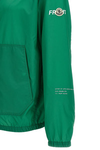 cod. K109U1A00009M5238841 Moncler x FRGMT 'Ostria' bomber jacket in water-repellent coated nylon canvas with prints at the back and on the sleeves, ribbed cotton collar, zip closure, pockets, long sleeves with elastic cuffs, felt logo patch, and elastic hem. The garment is embellished with printed bunnies created by Nayeon & Rang, a Korean illustration studio known for operating on the K-pop scene. Color: Green Size & Fit: Comfort fit Composition: 100% polyamide Made in: Romania