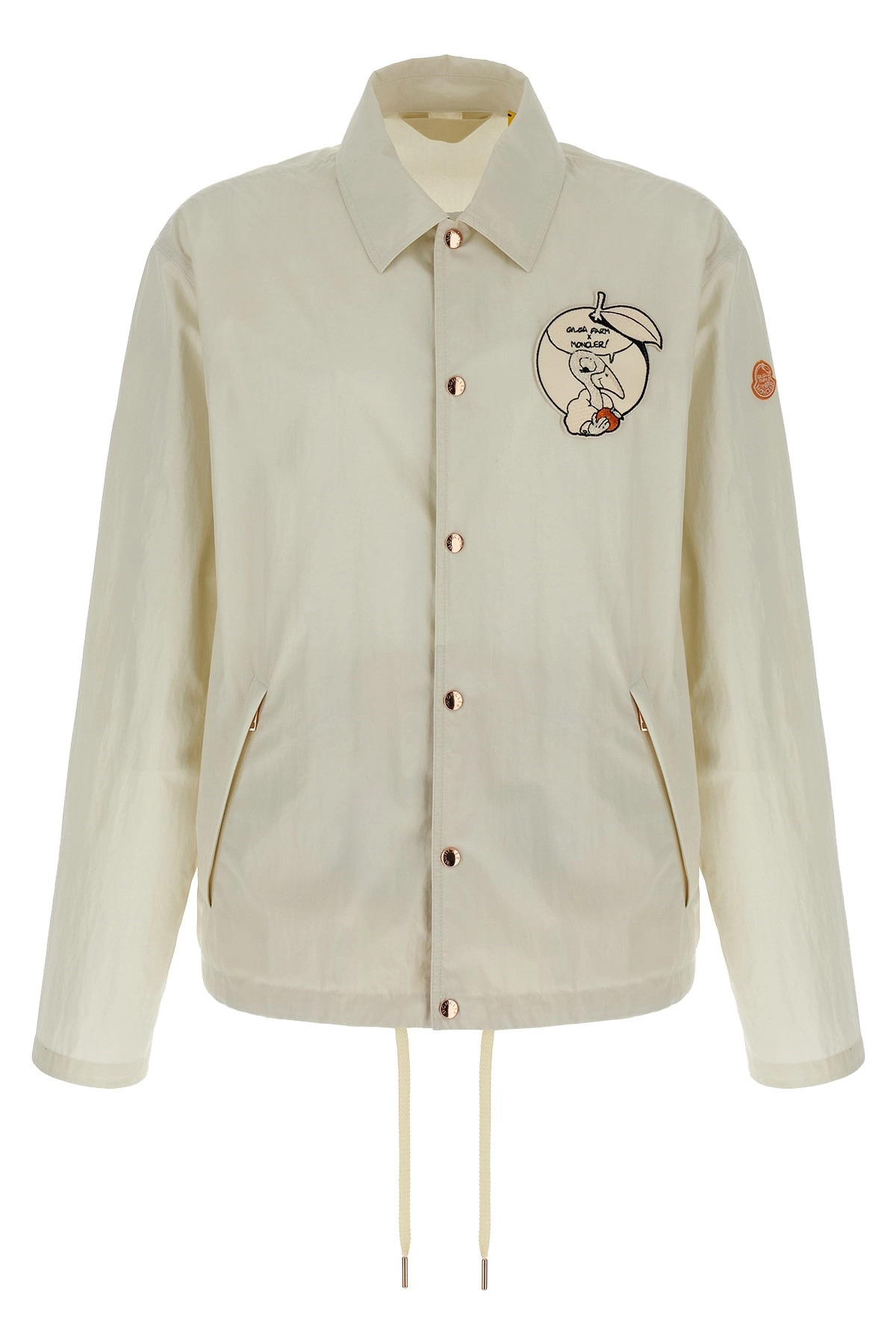 cod. K24021A00006597F902B Donald Glover's Moncler x Gilga Farm 'Satsuma' jacket in cotton blend, unlined, embroidery patch on the front and back, shirt collar, front snap button closure, pockets, long sleeves, drawstring on the hem. Color: White Size & Fit: true to size fit Composition: 66% cotton 34% polyamide Made in: Romania