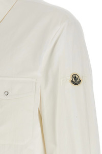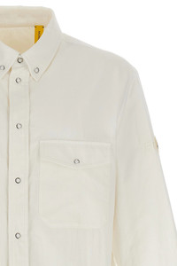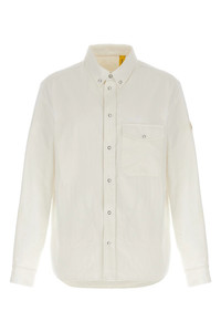 cod. K109U2F00002M5271001 Moncler x FRGMT Oxford cotton overshirt, boudin quilted nylon lining slightly padded with down, button down model, snap button closure, breast pocket, long cuffed sleeves, tone-on-tone embroidery and felt logo patch applique. Color: White Size & Fit: true to size fit Composition: 100% polyamide Made in: Romania