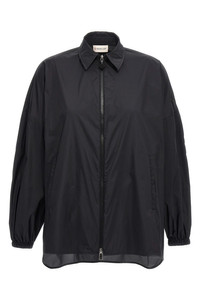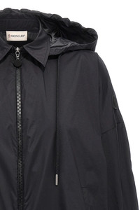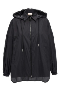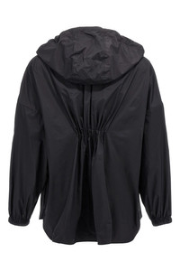 cod. K10932F00013596TM999 Windbreaker in tech fabric without lining, back ruffle detail, removable hooded shirt collar, front zip closure, pockets, long sleeves with dropped shoulders, elastic cuffs and tone-on-tone logo patch applique, side slits, and asymmetric hem. Color: Black Size & Fit: Comfort fit Composition: 100% polyamide Made in: Hungary