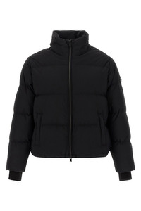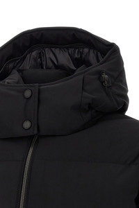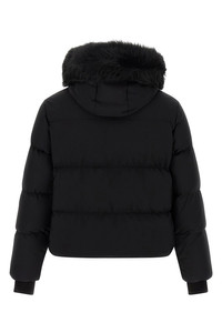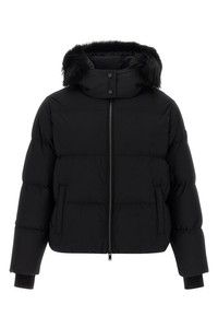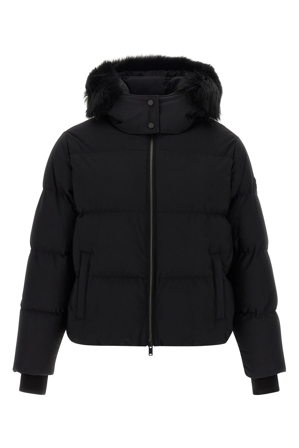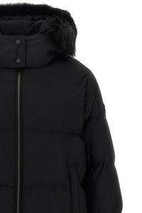 cod. M35LJ137S305 'Misti Puffer' down jacket in water-repellent fabric with goose feather padding, trapezoid silhouette, adjustable and removable hood with removable fur insert, standing collar, front zip closure, pockets, tongue sleeve with knitted cuffs and leather patch with metal logo applique, drawstring and knitted gaiter on the hem. Color: Black Size & Fit: true to size fit Composition: 76% nylon, 24% elastane Made in: South Korea