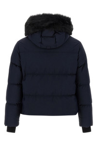 cod. M35LJ137S546 'Misti Puffer' down jacket in water-repellent fabric with goose feather padding, trapezoid silhouette, adjustable and removable hood with removable fur insert, standing collar, front zip closure, pockets, tongue sleeve with knitted cuffs and leather patch with metal logo applique, drawstring and knitted gaiter on the hem. Color: Blue Size & Fit: true to size fit Composition: 76% nylon, 24% elastane Made in: South Korea