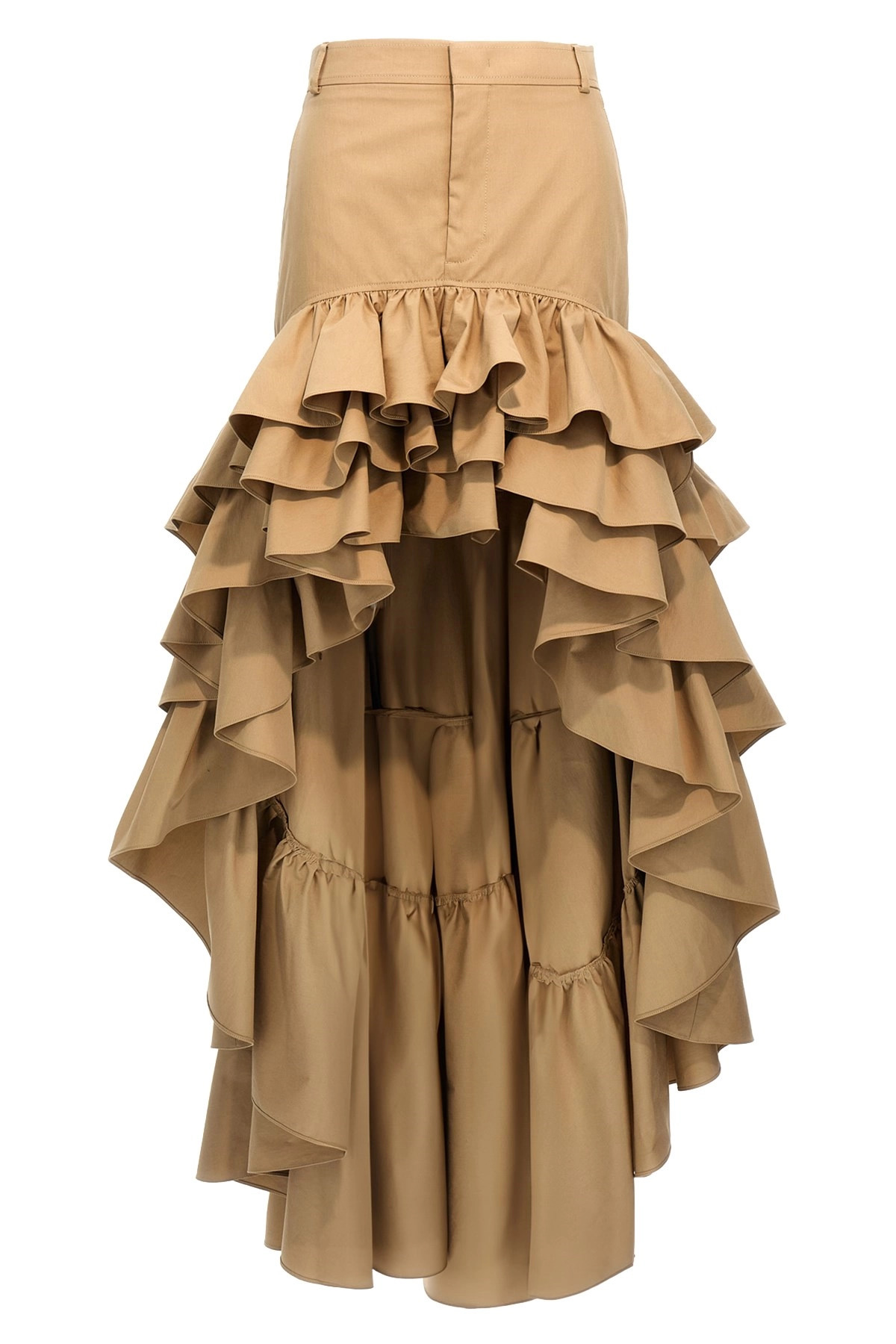 cod. A011805140081 Asymmetrical cotton canvas skirt with ruffles. Color: Beige Size & Fit: True to size fit Composition: 75% cotton, 25% polyamide Made in: Italy