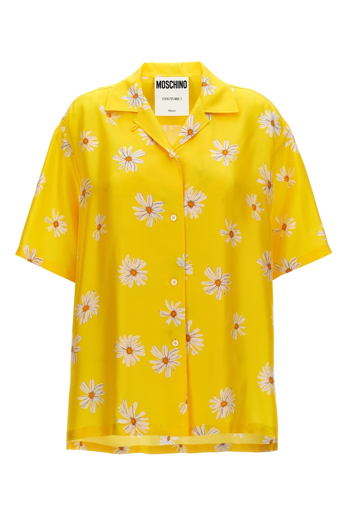 cod. A023205611024 All-over 'Margherite' print silk shirt, pajama model, loose fit, side slits. Color: Yellow Size & Fit: Comfort fit Composition: 100% silk Made in: Hungary