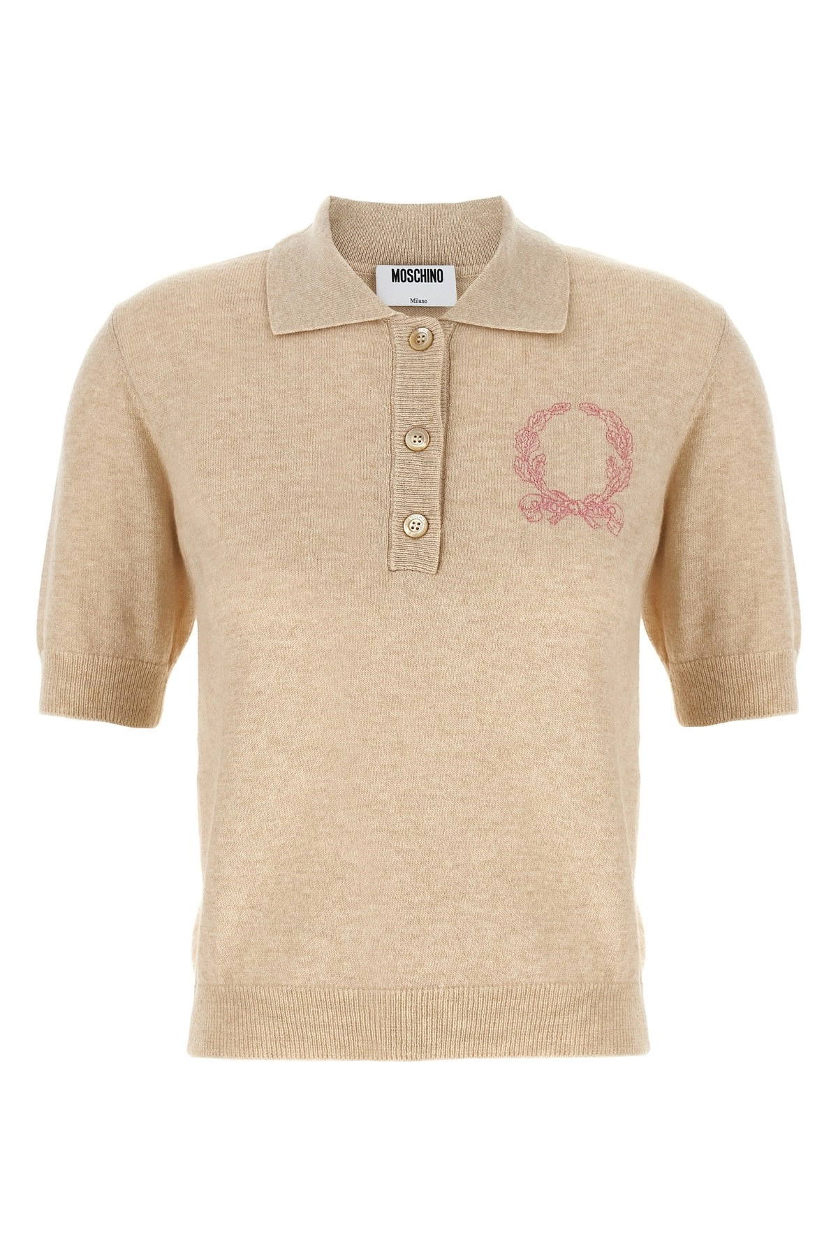 cod. A092955020018 Polo sweater in cashmere blend with collar, front button closure, front logo embroidery, short sleeves. Color: Beige Size & Fit: True to size fit Composition: 36% wo, 32% pa, 27% vi, 5% ws Made in: Italy