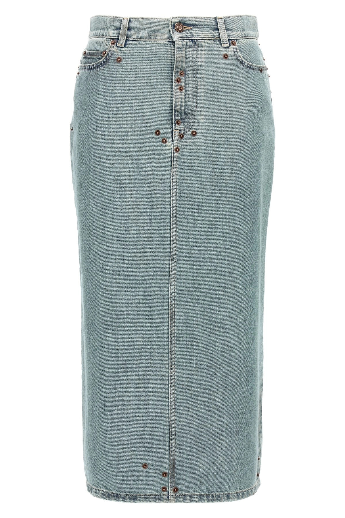 cod. J011854220349 Cotton denim skirt with all-over metal rivets, zip and button closure, five pockets, back logo tag. Color: Light Blue Size & Fit: true to size fit Composition: 100% cotton Made in: Italy