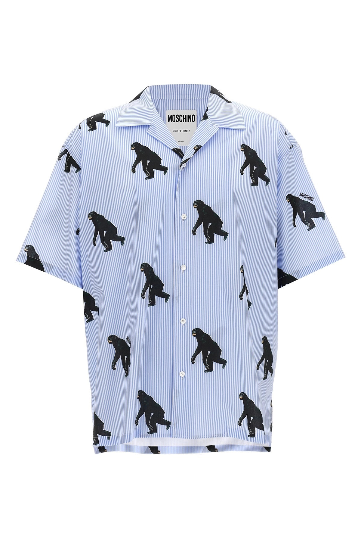 cod. A022602581303 Cotton shirt, all-over 'Scimpanze' print, front button closure, loose fit, side splits, and short sleeves. Color: Light Blue Size & Fit: True to size fit Composition: 100% cotton Made in: Italy