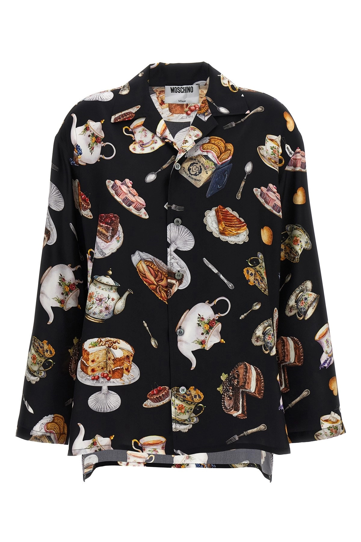 cod. A023655591555 All-over 'Tea time' print silk shirt, V-neck with lapels, front button closure, asymmetric length, side splits, long sleeves. Color: Multicolor Size & Fit: True to size fit Composition: 100% silk Made in: Hungary