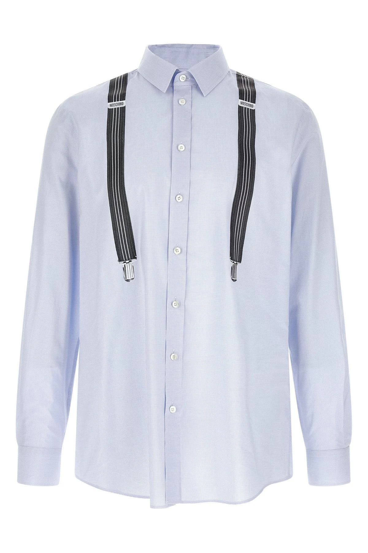 cod. A023802364266 Cotton vichy shirt with trompe-l'œil print in the shape of suspenders on the front and back, front button closure, long cuffed sleeves and a slightly reduced shoulder. Color: Light Blue Size & Fit: true to size fit Composition: 100% cotton Made in: Italy